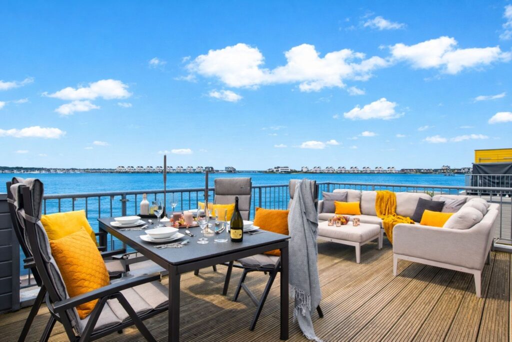 In der exzellent ausgestatteten Küche können Gäste regionale Spezialitäten zubereiten. Alternativ zur Nutzung des Herds oder Kochfelds stehen ein WMF-Tischgrill, ein Raclette und ein elektrischer Webergrill zur Verfügung. Die freie Lage und die bodentiefen Fenster ermöglichen einen Panoramablick auf den Yachthafen und einen eindrucksvollen Sonnenuntergang.