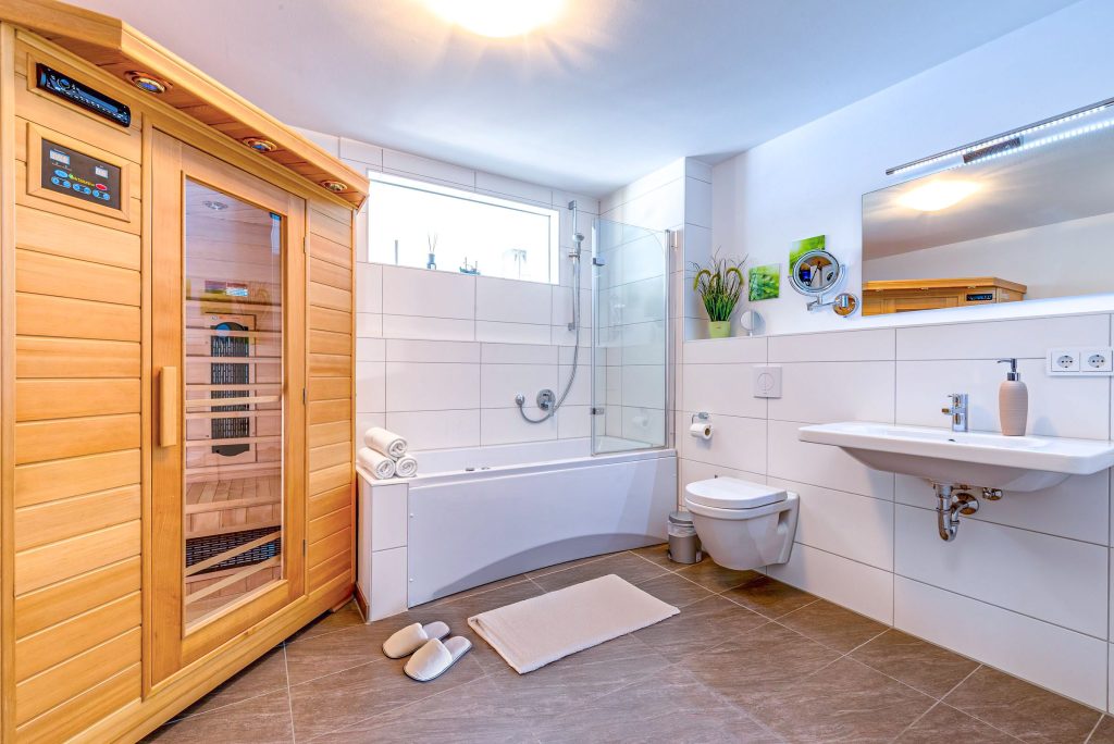 Das moderne Badezimmer ist mit einer Badewanne, Dusche und WC ausgestattet.