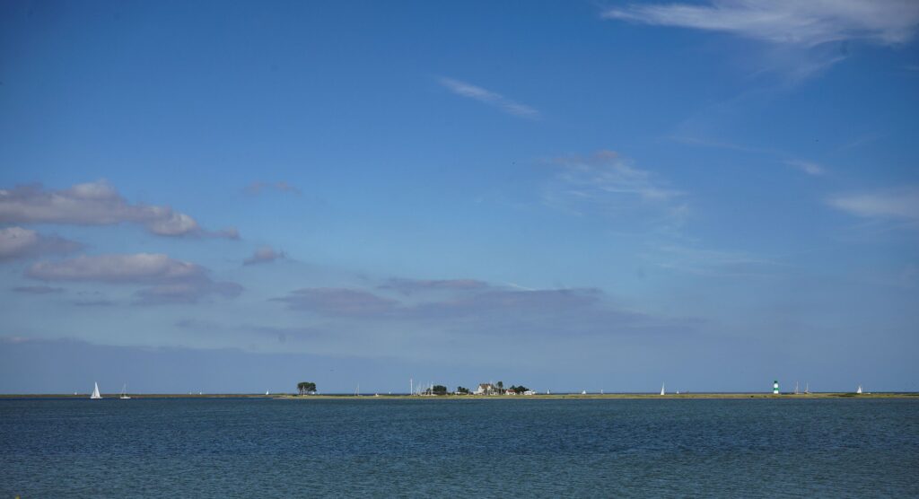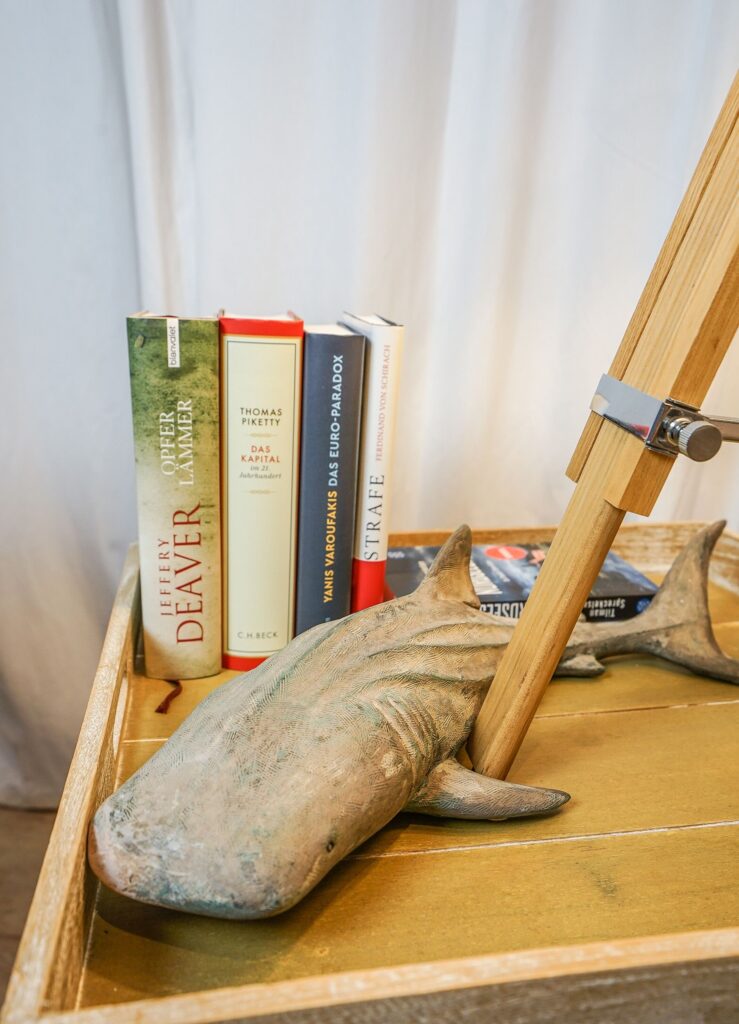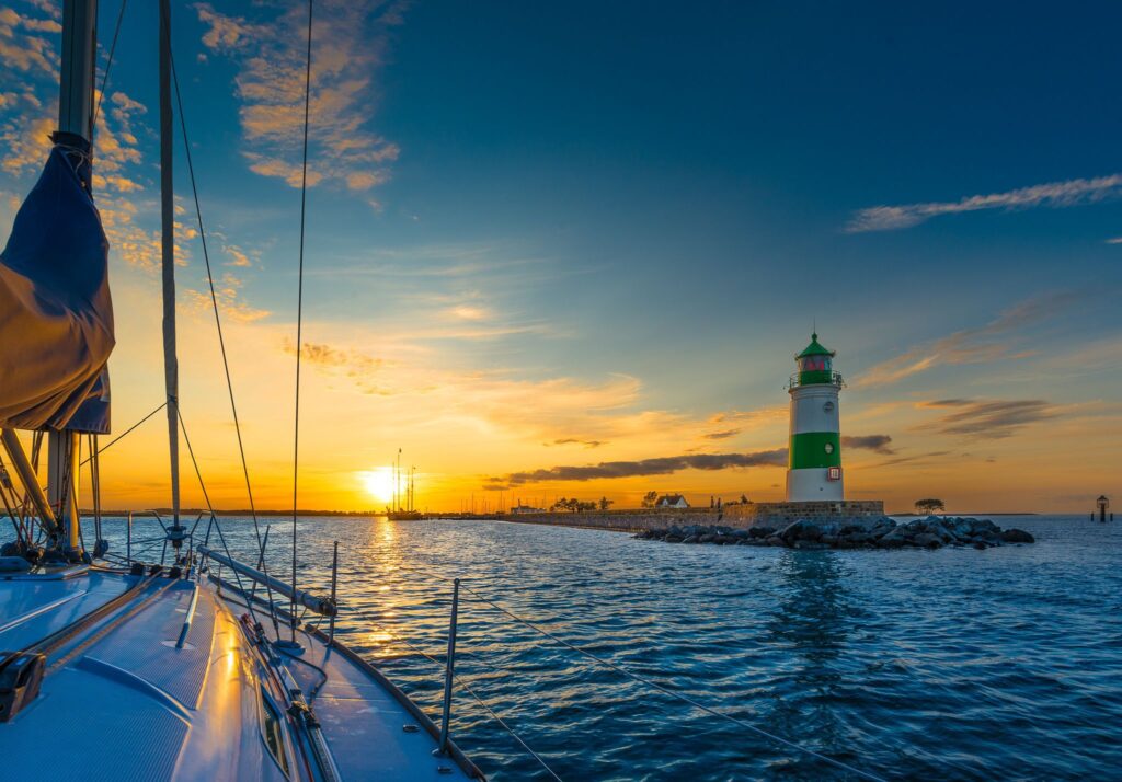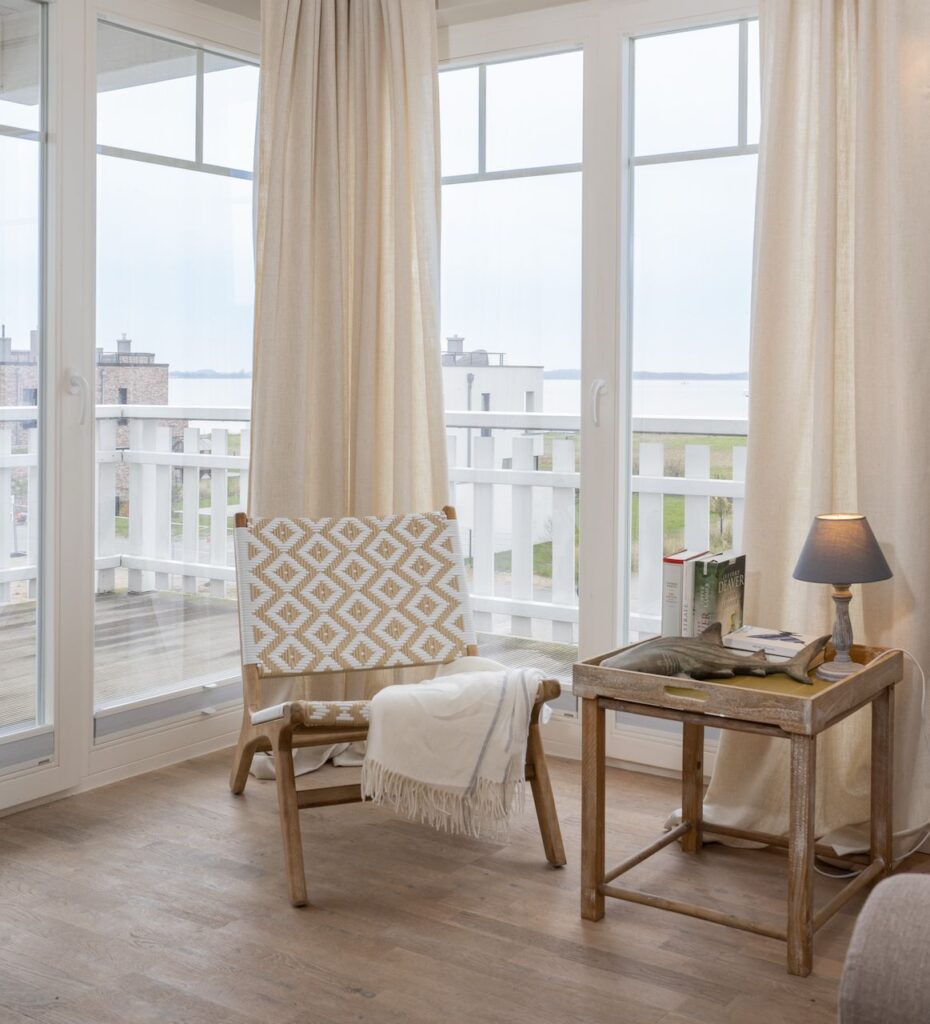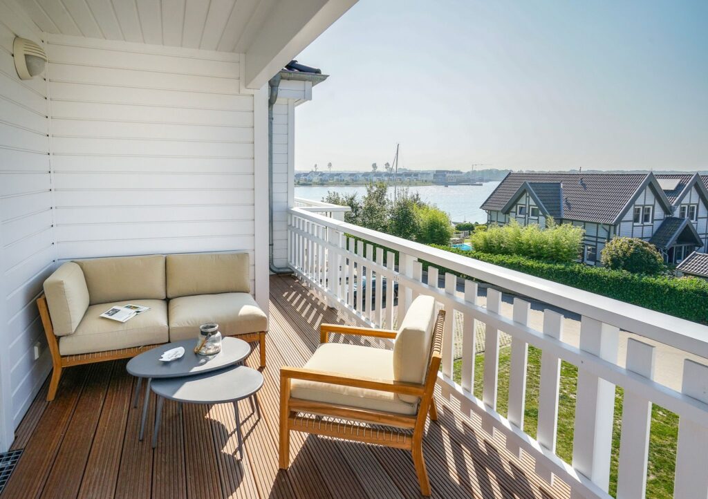 Oben wird die Dachterrasse schnell zum Lieblingsplatz: mit weitem Blick über den Hafen des Resorts und die Schlei, besonders schön in den ruhigen Abendstunden.