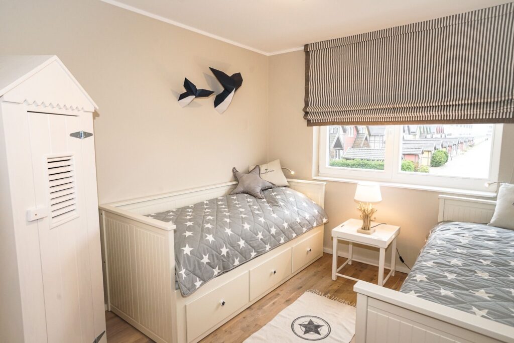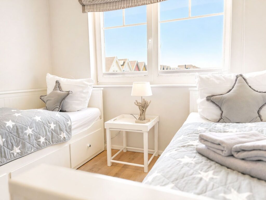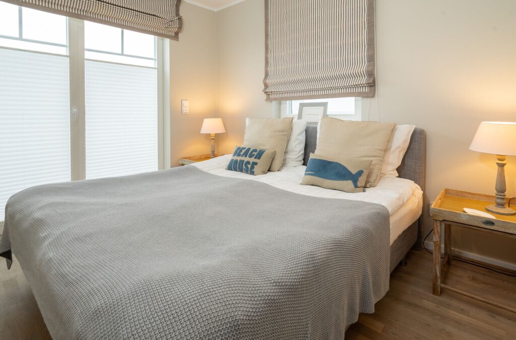 Das Ferienhaus verfügt über zwei Schlafzimmer. Eines mit Boxspringbett, eines mit zwei Einzelbetten. Im Loungezimmer im 2. Obergeschoss befindet sich zusätzlich ein Schlafsofa, sodass auch eine 5. Person bequem Platz findet.