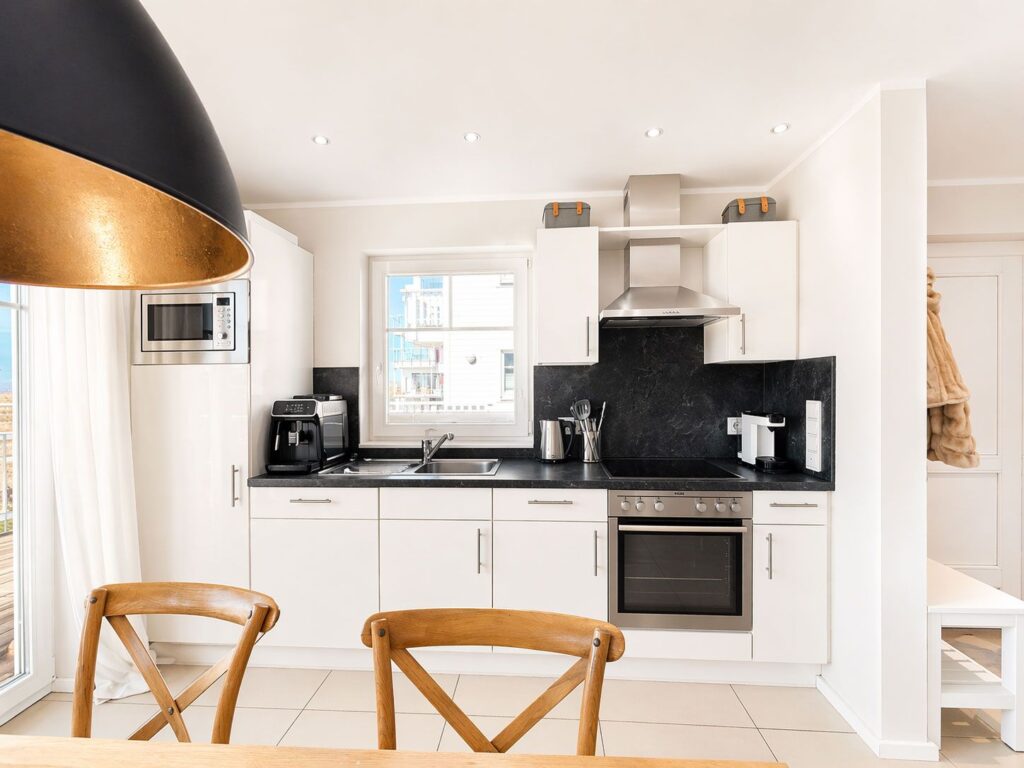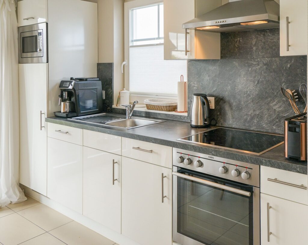 Der helle Wohn- und Essbereich mit offener, hochwertig ausgestatteter Küche ist der Mittelpunkt des Hauses. Hier wird gemeinsam gekocht, gegessen und entspannt — mit direktem Zugang zur Westterrasse, auf der sich sonnige Nachmittage und lange Abende im Freien genießen lassen.