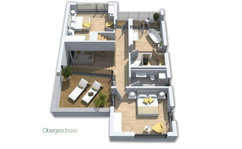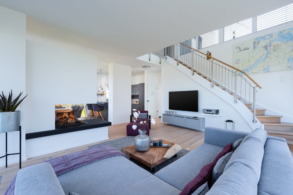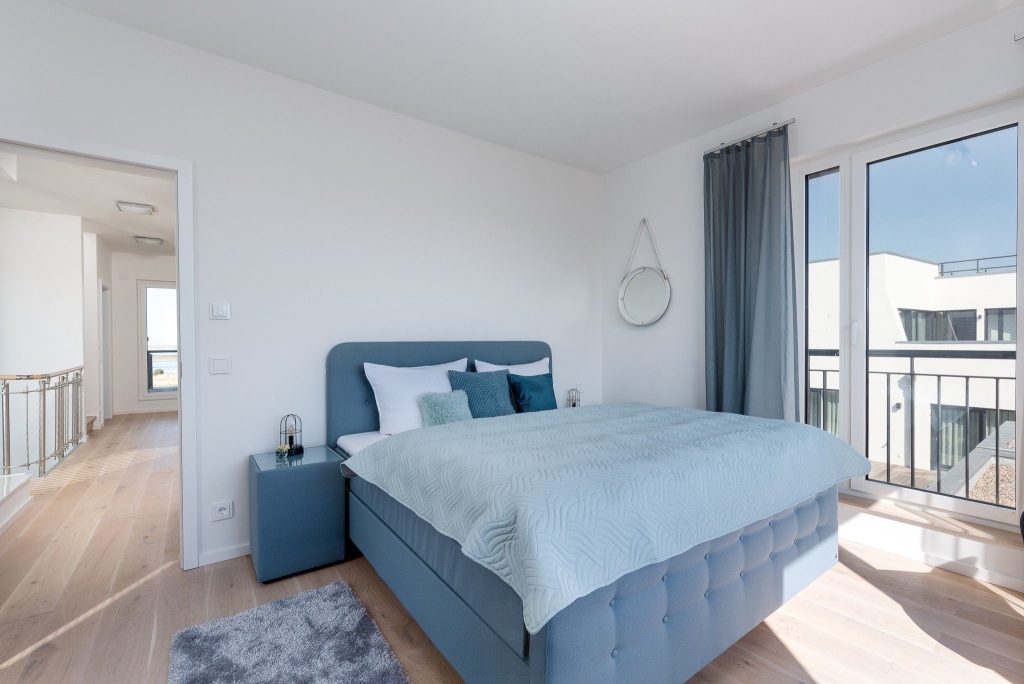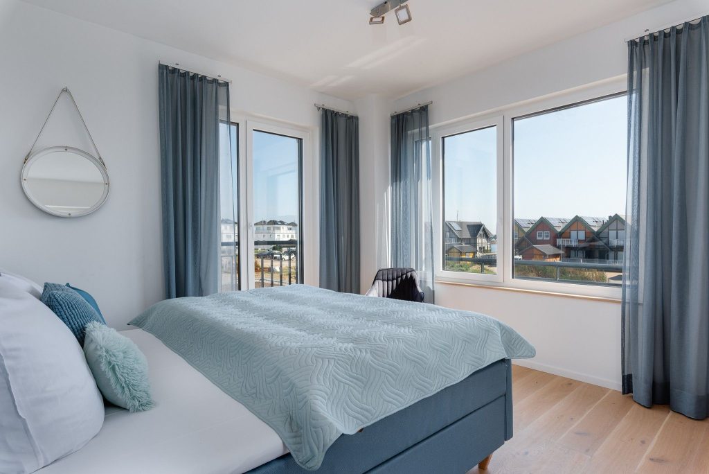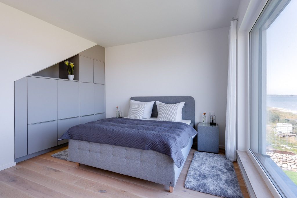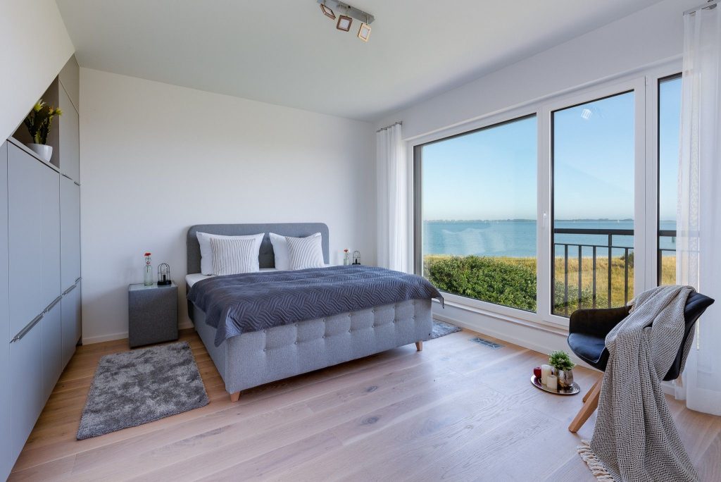 Obergeschoss: Die integrierte Treppe führt Sie ins Obergeschoss, wo Sie zwei luxuriöse Schlafzimmer und ein Badezimmer finden. Der Masterbedroom mit Boxspringbett und Panoramaverglasung lässt Ostseeträume wahr werden. Das Highlight? Das großzügige Badezimmer mit frei stehender Badewanne und einer finnischen Sauna mit Blick auf die Ostsee.