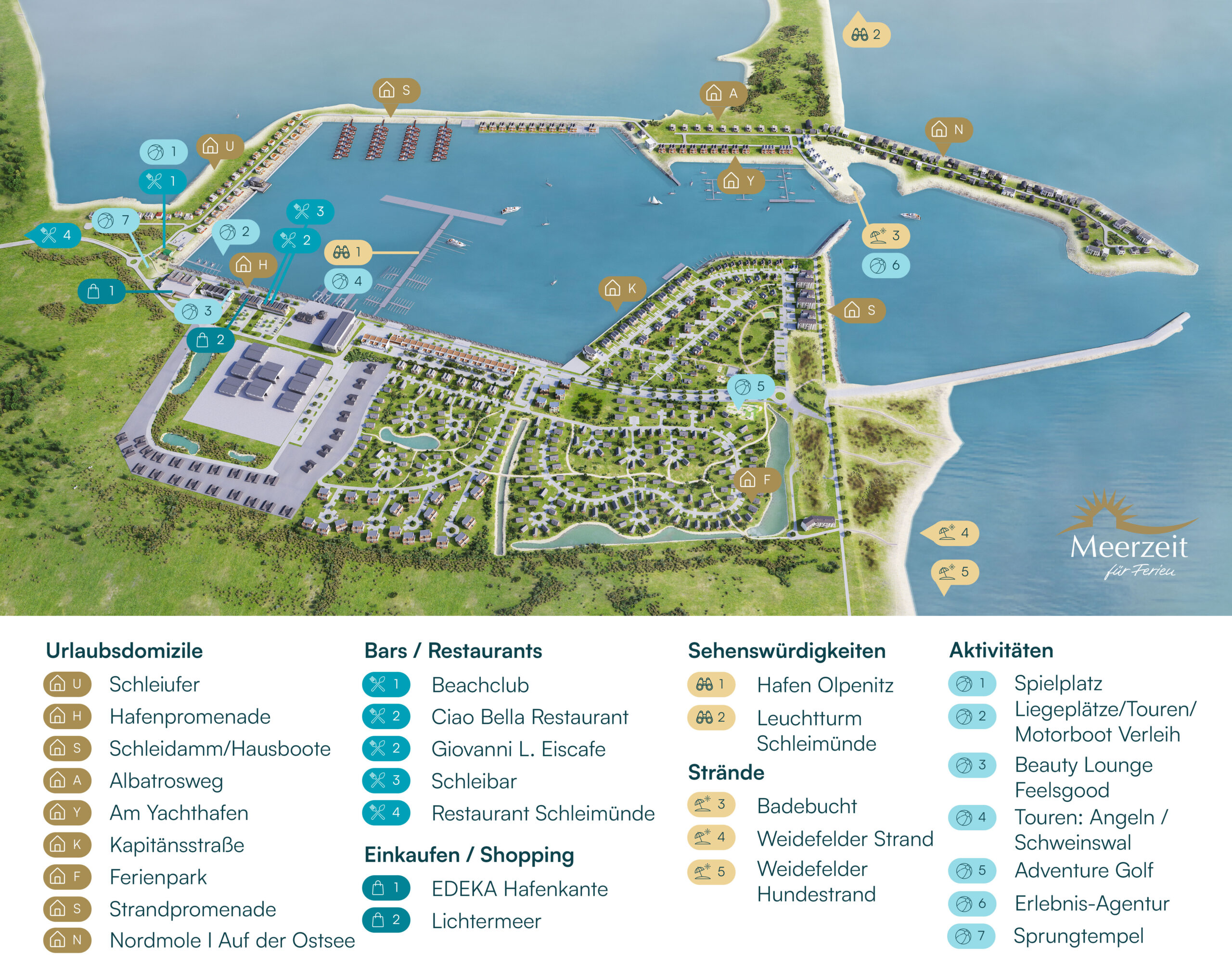 Für Eigner bietet Meerzeit für Segeln zehn exklusive Liegeplätze an der neuen Steganlage am Schleiufer im Ostseeresort Olpenitz. Das Hafenbecken, einst Marineschutzhafen, hat eine breite Einfahrt und ist durch zwei Molen gut vor Schwell geschützt. Edeka, Beachclub und Hafenpromenade sind nur wenige Schritte entfernt.